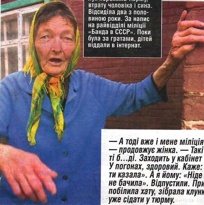 — А тоді вже і мене міліція почала тягати, — продовжує жінка. — Такі були наглі, ті 6...ді. Заходить у кабінет генерал. У погонах, здоровий. Каже: «Ти була, ти казала». А я йому: «Ніде не була і нічого не бачила». Відпустили. Прийшла додому, побілила хату, зібрала клунки і готовилась уже сідати у тюрму.