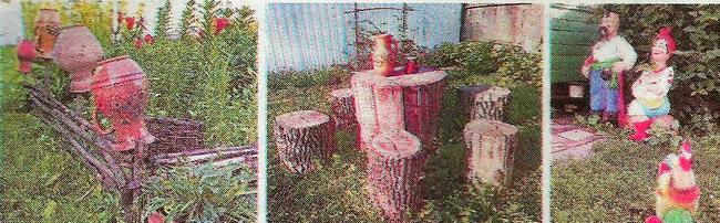 Ліса (тин) з лози - спільна робота Тані й Петра. Красуються біля і в дворі перевернуті глечики. Посеред великого подвір’я - ландшафтний дизайн: комбінація з каменів, квітів, садових фігур. Тут вам і лелеки, і півники, качки, зелена жаба. До хати запрошують козак із справжньою українською жінкою.