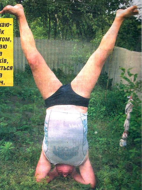 Микола Іванович веде у садок. Показує город. А заразом — як робить стійку на голові. При цьому тримає рівновагу, коли розводить ноги в різні боки.