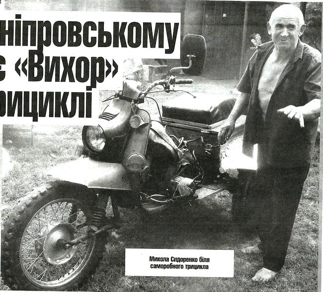 — Проект був у голові. У цьому трициклі є все, що хочеш. Деталі з «Мурав’я». Цепку сам складав. Мотор з мотоцикла «!Ж». їздить на бензині, бере літрів п’ять на сто кілометрів. Все зварив докупи. Трициклом буду їздити на зимову риболовлю. Спеціально для цього і робив його. Як нормально буде тягнути по кучугурам, лишу як є. А ні — дороблю четверте колесо. І стане квадроциклом.