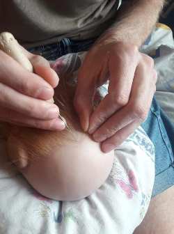 Далі майстер-реборніст прикріплює волосинки. Це дуже копітка робота, проте, на щастя, «новонародженим» багато волосся не потрібно. Його «вживлюють» за допомогою голок, протягуючи волосинки крізь заготовку голови. Схожим чином нарощують малюку й вії. Довершену ляльку справді легко сплутати зі справжньою дитиною. Бували випадки, що Сергію навіть місцем у транспорті поступалися, коли він віз свого «малюка» у нову прийомну родину.