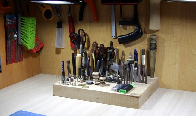 - Сейчас у меня есть много всего необходимого: 3 вида косого пробойника, шило, нитки, просечки разных размеров, сликеры, инструменты для уреза края кожи, ремнерез, несколько видов ножниц, пинцетов, линейки длиной от 30 см до 1 м, специальные краски для закрашивания торца кожи, краски на восковой основе, грунт для кожи, химические средства для обработки кожи (увлажнители, придающие матовость и др.), 3 вида бормашинок для обработки края кожи, нитки вощеные 10 цветов и др.