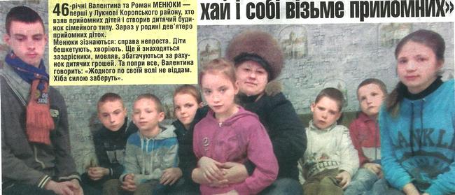 — У районі чотири прийомні сім’ї. Дві у Лукнові, одна в Коропі і одна у Билці, — говорить Оксана Нестеренко, начальник відділу сім’ї, молоді та спорту. — Великих зауважень до сім’ї Менюків не було. Будинки облаштовані, продукти харчування є. Діти не голодні.
