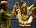 Британский художник Марк Куинн представил золотую статую известной английской топ-модели Кейт Мосс. Скульптура "Сирена" стоимостью 1,5 миллионов фунтов стерлингов и весом 50 килограмм является одним из экспонатов открывшейся в Британском музее выставки "Статуяфилия".