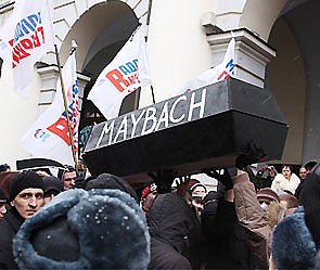 Участники пикета держали над головами черный гроб с надписью "Майбах", символизирующий дорогой автомобиль, на котором ездит лидер ЛДПР Владимир Жириновский. Молодогвардейцы даже пытались преподнести этот гроб в подарок Жириновскому и его коллегам. ОМОН, окружавший пикетчиков, в акцию не вмешивался, передает "Интерфакс".