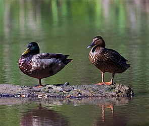 Самец мандаринки почти вдвое меньше по размеру, чем его избранница. Однако "японский кавалер" везде сопровождает свою спутницу и умудряется отгонять более крупных селезней. Отметим, что вначале он общался с одной уткой из России. Но некоторое время назад эта птица попала под машину и погибла. Три дня самец мандаринки горевал, а потом нашел себе новую крякву, прилетевшую из Сибири.