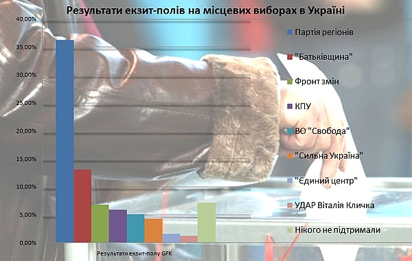 При этом обращает на себя внимание успех правонационалистической партии "Свобода", которая, согласно экзит-поллам, лидирует в Ивано-Франковской, Тернопольской областях, а также на выборах во Львовский горсовет. Экзит-поллы показывают также на западе Украины небольшой рост популярности партии "Фронт змин".