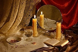 Через литературу широко прославилось и гадание на зеркалах. Следует выгнать из комнаты всех посторонних лиц (и даже животных), взять два больших зеркала, установить их друг к другу, и осветить двумя свечами. Так, чтобы с одного зеркала к другому образовался будто длинный освещенный огнями коридор. И вот в конце этого коридора и должен появиться суженый. Правда, всматриваться, ожидая его появления, можно довольно долго, да и вместо "любимого" пролезть туда может всяческая нечисть.