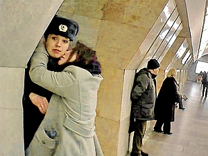 Активистки российской арт-группы "Война" бросались с объятиями и поцелуями на женщин-правоохранителей в метро, в подземных переходах и просто на улице в центре Москвы.