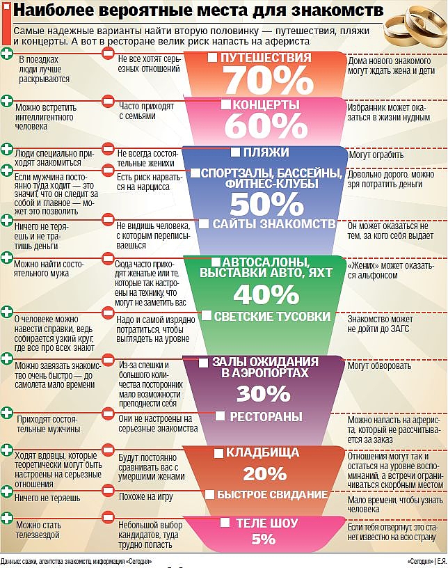 А вообще, по ее словам, познакомиться можно где угодно - главное, чтобы было желание. "Моя знакомая, к примеру, познакомилась со своим будущим мужем в ресторане. У нее сломался каблук, и он помог ей добраться домой", - говорит Нина.