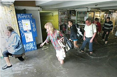 Досталось от дождя больше всего Шулявке. Переход под пр. Победы возле метро затопило полностью. Оттуда даже выплывали люди. «Подхожу к переходу, вода до потолка. И тут раз — мужик выплывает с барсеткой. Сказал, что деньги поплыл забирать», — рассказывает киевлянин Иван. Пр. Победы был усеян сорванными люками. «Там еще плавали баклажаны, помидоры, тапочки. Это мне все в лобовое стекло врезалось. Видно, из затопленных переходов», — говорит киевлянин Алексей.