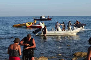 Как рассказали спасатели, эта лодка (пассажировместимостью - 12 человек) вышла в море для занятий дайвингом в акватории бухты Двуякорная. На борту находились 31 пассажир (граждане Украины, России и Беларуси, среди них - двое детей) и три члена экипажа.