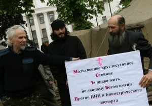 В руках у них плакаты с надписями: "Нет электронному реестру для православных", "Мы против электронного паспорта", "Мы против электронного концлагеря", "ID-карты - метка дьявола, электронный паспорт - пропуск в ад".