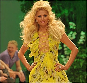 Знаменитая блондинка приехала в Киев. Она вышла на подиум Украинской Недели Моды в платье Андре Тана, которое специально для нее пошили за ночь. Пэрис не захотела показывать живот, но оголила ноги.
