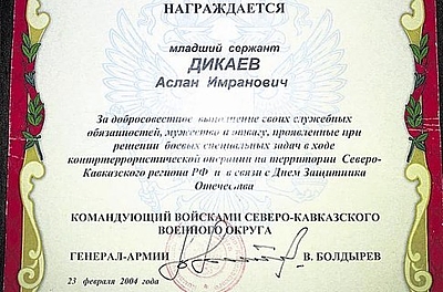 Тогда он, по словам Адама, работал... в уголовном розыске милиции Чечни, в Грозном. Трудился по «по профилю» — образование Аслан получил в юридическом колледже Волгограда! После этого Дикаев вернулся в Грозный и в 18 лет пошел в армию. Служил поначалу в батальоне Минобороны России «Восток», а потом перевелся в батальон спецназа «Запад» (батальоны «Восток» и «Запад» набирались из уроженцев Чечни и использовались для борьбы с бандформированиями. — Авт.). После нескольких лет службы в армейском спецназе Дикаев демобилизовался и устроился на службу в угро Грозного. Адам Дикаев уверяет: его брат — младший сержант Аслан Дикаев, четырежды был награжден орденами, медалями и грамотами РФ за подвиги, совершенные в ходе контртеррористических операций против чеченских боевиков в ходе 2-й чеченской войны.«Он был верующим и очень добрым. Не пил и не курил», — уточняет Адам. К слову, третий, самый старший брат Аслана — Алик Дикаев — погиб на 1-й чеченской войне, воюя на стороне федералов.