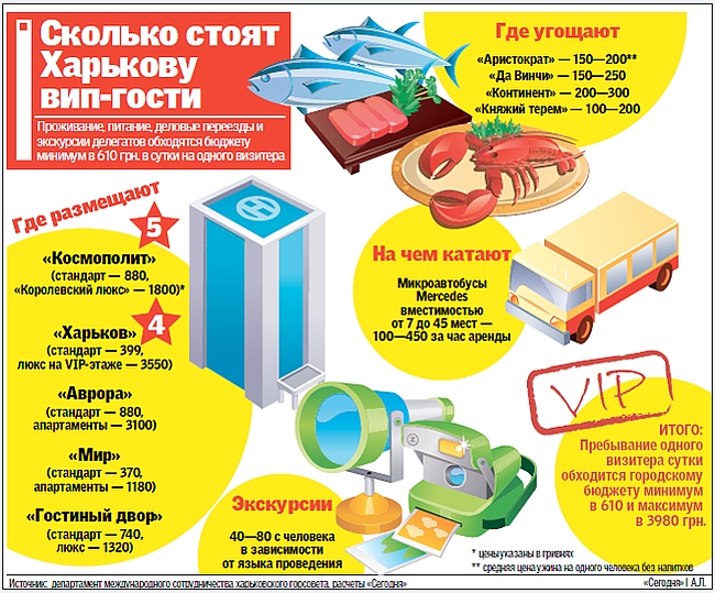 По правилам, всех гостей встречают хлебом-солью и везут по заранее запланированному маршруту на встречи и переговоры. Гостей, как правило, возят на микроавтобусах, дорогих машин для перемещения визитеров не заказывают, рассказали нам в мэрии. Живут гости в четырех- и пятизвездочных гостиницах, а вот апартаменты в три звезды визитерам не предлагают. Кроме индивидуальной программы пребывания, для каждой зарубежной делегации предусмотрена и своя экскурсионная программа. К примеру, визитеров из Израиля обязательно везут на Мемориальный комплекс «Дробицкий Яр», созданный в память о жертвах фашистского геноцида, а вот польским делегатам предстоит возложить цветы на польском кладбище жертв тоталитаризма. «Иностранным гостям мы показываем центральные улицы и старейшие памятники. Всех впечатляют масштабы площади Свободы, фонтаны и парки. Делегаты отмечают, что город очень зеленый. Однако отпустить иностранца самостоятельно на экскурсию мы не можем, поскольку у нас еще не разработаны такие маршруты, а уровень английского оставляет желать лучшего, поэтому всех гостей приходится всюду сопровождать», — рассказал советник мэра Виктор Христоев.