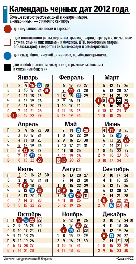 В 2012 году Украину и мир ожидает 51 «черный день». Об этом свидетельствует «календарь выживания», составленный народным синоптиком из Днепропетровска Валерием Некрасовым. В нем ежемесячно выделяются даты, в которые наиболее вероятны природные катаклизмы и стихийные бедствия, аварии, травмы и несчастные случаи (см. инфографику). Свои расчеты Некрасов основывает на изменении активности Солнца и гравитации Луны. По количеству потенциально «аварийных» дней 2011 и 2012 годы получились примерно похожи, говорит синоптик, но в свежем календаре он впервые прогнозирует новый вид «черных дат» — дни, когда возрастает неуравновешенность людей и риск заработать стресс. В такие дни он советует умерить нагрузки и успокоиться. Также синоптик отмечает «день особой опасности», когда возможны крупные катаклизмы и стихийные бедствия — в 2012-м это будет 22 марта (в этом году было 23 марта, однако ничего суперстрашного в этот день не произошло, только умерла актриса Элизабет Тейлор. — Авт.). «Точно так же, как ежедневный прогноз погоды, надо просматривать и «календарь выживания» — это поможет сберечь нервы, здоровье, а порой и жизнь», — уверен Некрасов. Его коллега из Луганска Леонид Горбань тоже трудится сейчас над аналогичным прогнозом на 2012 год — говорит, охота докопаться, что в нем такого нестандартного, вызывающего массу слухов о конце света.