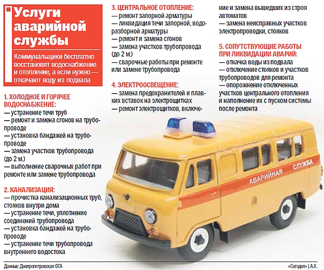 24 часа в сутки шесть аварийных бригад будут готовы помочь в устранении неполадок с теплом, водоснабжением, канализацией и электричеством (весь перечень услуг см. в таблице). Причем, по словам депутата Днепропетровского горсовета Инны Рудкевич, в случае аварии горожанам не придется платить новой службе за помощь. «Оплата входит в тарифы служб, предоставляющих коммунальные услуги. Аварийная служба и раньше была в Бабушкинском районе, но теперь она будет более современной, более мобильной и качественной. Машины оснащены необходимыми для устранения аварий материалами, газосваркой и др. Это позволит на месте устранить неполадку, а не ждать, пока придут работники жэка со всем необходимым инструментарием», — пояснила депутат. Таким образом, в случае острой необходимости горожанам только на вызове специалиста удастся сэкономить порядка 50 грн. Так, например, за труд слесаря или электрика обычно приходится платить по 30—50 грн. за вызов плюс 70—80 грн. за час работы. А если еще накинуть традиционный полтинник «за срочность», то выйдет сумма около двухсот гривен, и это без учета возможной замены приборов или труб.