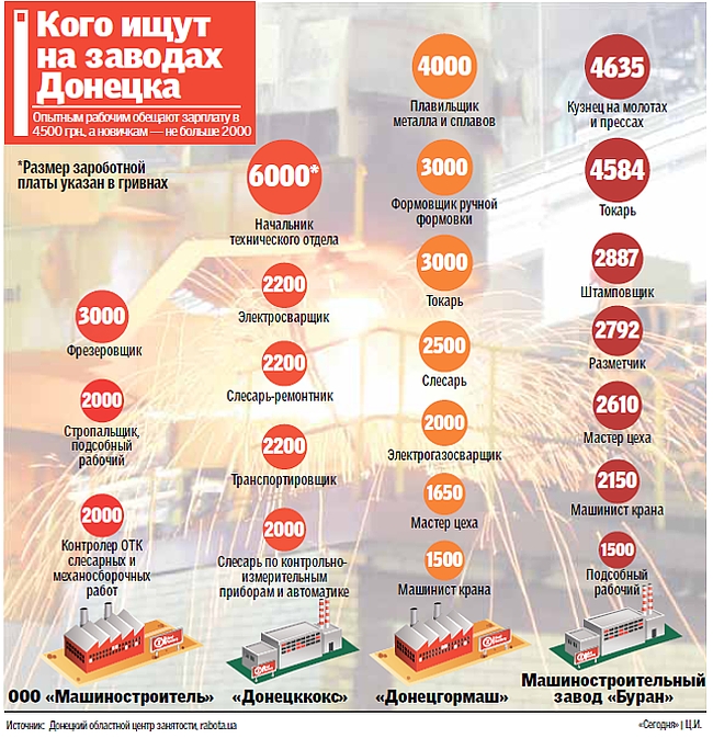 Донецкие предприятия стали зазывать к себе на работу специалистов разных профилей. Готовы даже брать новичков без опыта работы, обещают научить ремеслу. Подтверждают это и специалисты Донецкого областного центра занятости. «Самые популярные профессии, на которые сегодня есть спрос, — это профессии высококвалифицированных рабочих — слесарей, токарей, электрогазосварщиков, водителей, горняков, продавцов и других представителей рабочих профессий», — рассказали «Сегодня» в Донецком областном центре занятости.