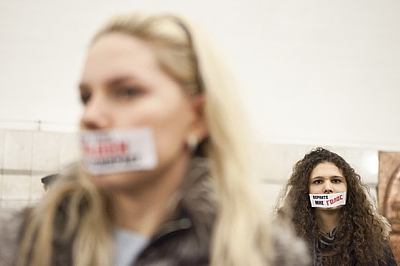 На центральных станциях московского метро прошел флешмоб против фальсификации результатов выборов в Госдуму. Молодежь заклеила себе рот белыми лентами с надписями вроде "Они украли наши голоса", "Верните мне голос", "Больше молчать нельзя".