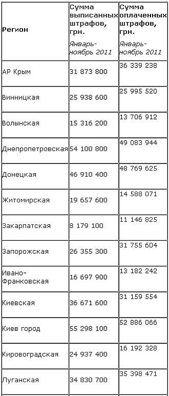 Сколько начислено и уплачено штрафов ПДД в Украине за январь-ноябрь 2011 года: