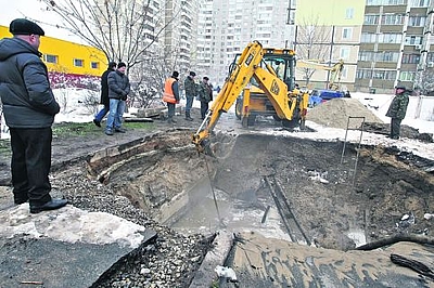 По данным «Киевводоканала», без воды остались школа, детсад и шесть жилых многоэтажек. Вчера справиться так и не удалось, работы продолжат и сегодня. «Произошел прорыв трубы диаметром 300 мм. Вода стала вытекать и размывать песок, образовалась пустота, затем провал», — сказала нам Виктория Яковлева, советник по информации «Киевводоканала».