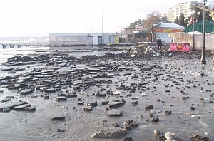 Там, помимо многочисленных повреждений пляжных сооружений, из-за подмыва подпорной стены провалилась заасфальтированная дорога. Часть набережной, недалеко от клуба «Кастель» и пансионата «Море», просто ушла под землю, образовалась большая яма длиной около 30 м, шириной порядка 9 м и глубиной 8-9 м. Въезд транспорта на территорию западной набережной из-за этого запрещен.