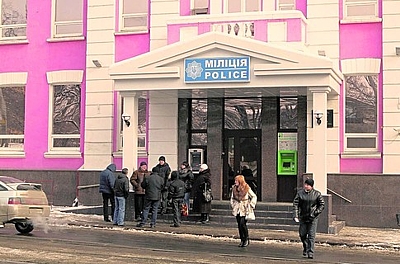 Специально к Евро-2012 на фасадах всех отделений милиции установили ярко-синие вывески с подсветкой, на которых написано: "міліція" и police.