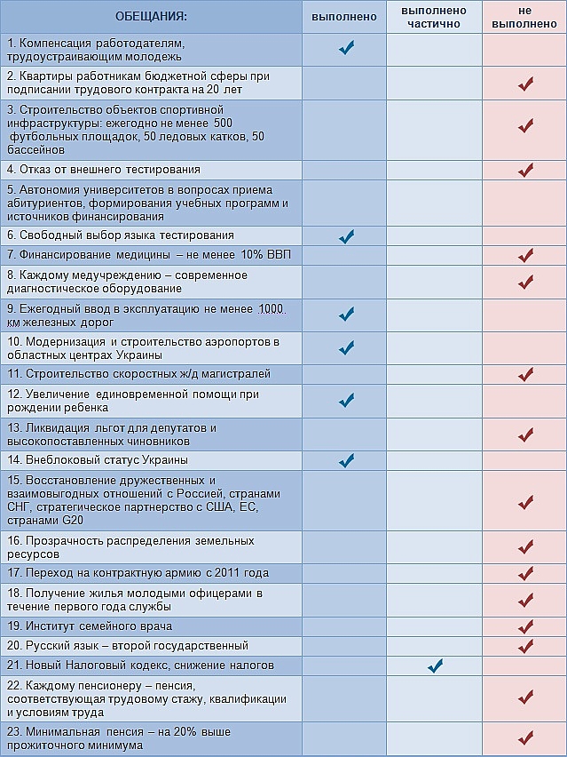 Зато по остальным пунктам вряд ли можно найти позитивные сдвиги. И если скоростные ж/д магистрали еще можно ожидать (пока в количестве одной, и то к чемпионату Евро-2012), то говорить об ипотеке в 7%, институте семейного врача и 75% бюджетных местах в вузах не приходится (Рада недавно провалила такой законопроект). Не очень понятно, когда будут и будут ли вообще выполнены такие «сказочные» обещания, как компенсации работодателям при трудоустройстве молодежи, выдача квартир работникам бюджетной сферы, подписавшим контракты на 20 лет, и автономия университетов (их наоборот больше подчиняют Министерству образования).