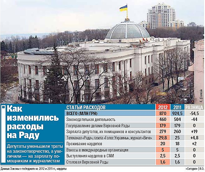 Верховная Рада утвердила смету своих расходов на этот год, сообщает пресс-служба парламента. На какие основные статьи расходов пойдут заложенные в бюджете почти 870 млн грн (в том числе 785 млн грн — из общего фонда, который обязательно будет профинансирован, а 85 млн грн — из специального, расходы которого зависят от реально полученных доходов бюджета). Это почти на 55 млн грн меньше, чем в 2011 году (тогда было 924,5 млн грн. — Авт.). Итого: в этом году в среднем один депутат обойдется народу в 1,93 млн грн, это на 120 тысяч дешевле чем в прошлом.