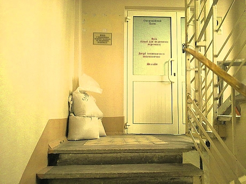 Работа полным ходом. В коридоре у отделения — мешки с цементом. Фото: П. Посохов