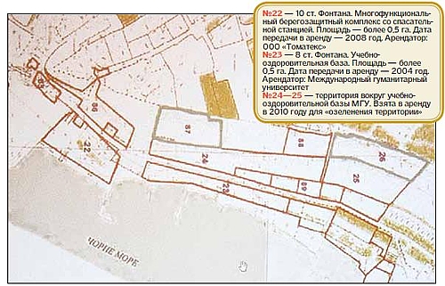 Многие участки городской собственности, судя по реестру, находятся на пляжах либо в зоне рекреационного назначения, где по закону строить вообще нельзя! Согласно документу, в 2007—08 годы мэрия удовлетворила желание доброго десятка различных фирм застроить склоны и береговую линию в районе 8—13 ст. Фонтана, дачи Ковалевского, Аркадии и Ланжерона отелями, высотками и развлекательными комплексами.