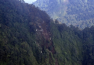 Индонезийское телевидение показало фотоснимки с места крушения самолета. По предварительным данным, SSJ-100 врезался в вертикальный склон горы, часть фрагментов осталась на склоне, часть упала вниз.