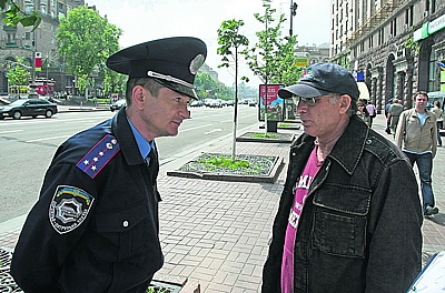 Познакомиться с украинскими сотрудником ГАИ возле палаточного городка, Майкл не смог. На фразу на английском: "Привет, меня зовут Майкл Найт, я американец", гаишник по-краински ответил: "Я Юрий, украинец". На этом и разошлись.