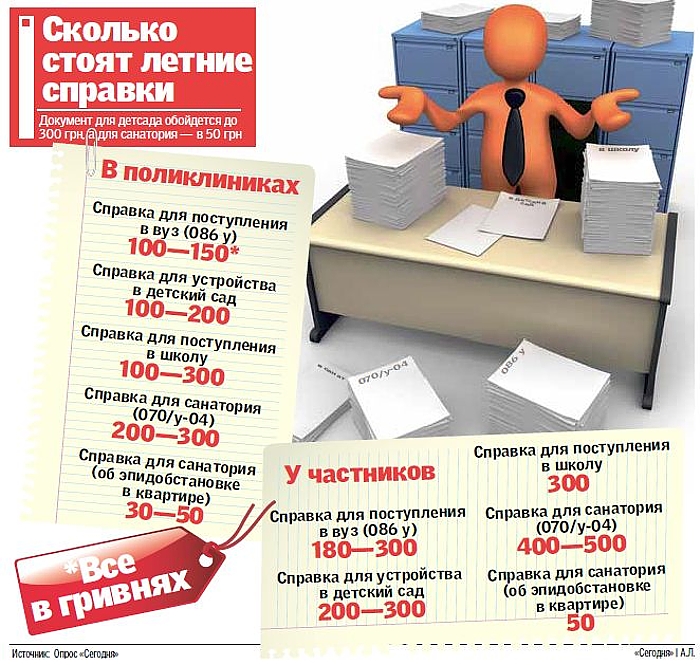 Говорят, что поликлиниках, в которых сейчас люди массово берут справки для поступления в вуз, садик, школу или для санаторно-курортного лечения, получить их даром почти невозможно. Дескать, врачи делают все, чтобы получить вознаграждение. Цена вопроса - до 300 грн.