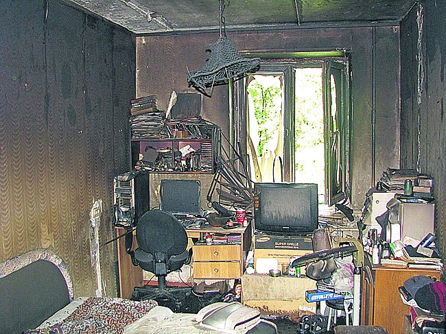 От огня пострадала 51-летняя владелица квартиры, Марина С. У нее — ожоги 15 % тела и отравление продуктами горения. Женщина в тяжелом состоянии доставлена в больницу. Пожар начался в ее комнате, когда та смотрела телевизор, рассказывает сын Марины, 28-летний Максим. «Я услышал громкий хлопок. Оказалось, что произошло замыкание, и телевизор просто взорвался. Все случилось за считанные секунды. Когда я вошел в комнату, кресло полыхало до потолка. У мамы были сильно обожжены руки», — вспоминает страшные минуты Максим. У него хватило сил вывести мать из квартиры, пока соседи вызывали пожарных. Из-за вынужденной задержки спасти ничего не удалось. Молодой человек показывает паспорт и свидетельство о рождении — это все, что ему удалось захватить с собой. От комнаты, где начался пожар, ничего не осталось. Когда мы вошли, груда, которая еще вчера была диваном, снова начала дымиться — в страхе ее тут же залили еще несколькими ведрами воды. Остатки бытовой техники стоят по углам: вентилятор согнулся пополам, бойлер расплавился и стек в унитаз, компьютер взорвался. «Спасибо пожарным — хоть комнату мою спасли. Жаль только потерянных минут: если бы начали тушить раньше, все, наверное, сейчас было бы не так плохо», — говорит Максим.