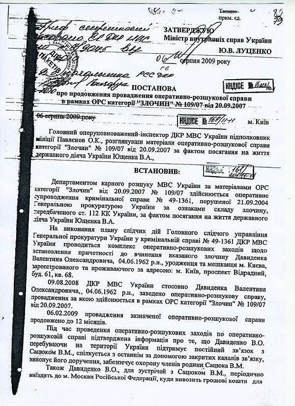 В распоряжение СМИ попал документ, который, собственно, и стал точкой отсчета. "В 2008-2009 годах органами МВД осуществлялись оперативно-розыскные мероприятия в отношении Валентина Давиденко, водителя бывшего первого зампреда СБУ Владимира Сацюка, на чьей даче Ющенко мог быть отравлен диоксином, – рассказал прокурор Виктор Клименко. – За Давиденко велось наружное наблюдение, его телефоны прослушивались. ОРД продлевалось до 12 месяцев и 4 августа 2009 года было закрыто. А через два дня его вдруг решили опять продлить – до 18 месяцев. Постановление утвердил министр Юрий Луценко. Видимо, против водителя Сацюка ничего не удалось добыть, и оперативно-розыскные мероприятия продолжили, нарушив и процедуру, и закон. Но нельзя продлить то, что закрыто. Мы усматриваем в этом халатность, вследствие которой были ущемлены конституционные права Давиденко".