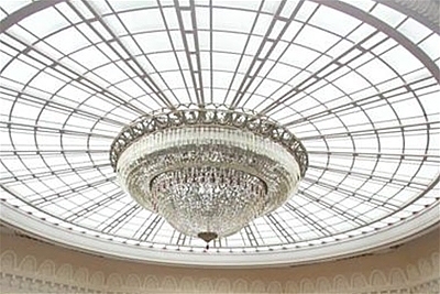 Купол состоит из металла, стекла обычного и цветного, а диаметр плафона – 16 метров. Высота конструкции около 10 метров, поэтому площадь стеклянной поверхности составляет не менее 500 "квадратов". А поскольку толщина стекла - минимум сантиметр, то над головой нардепов находится до пятнадцати тонн стекла и металла. И это без учета веса металлического шпиля на крыше и хрустальной люстры в форме подсолнечника, которая висит под куполом (еще 15 тонн).