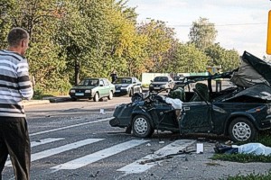 Под Винницей в поселке Стрижавка BMW после удара об бетономешалку взлетел в воздух и в полете срезал крышу ВАЗ 2107. Погибла женщина.