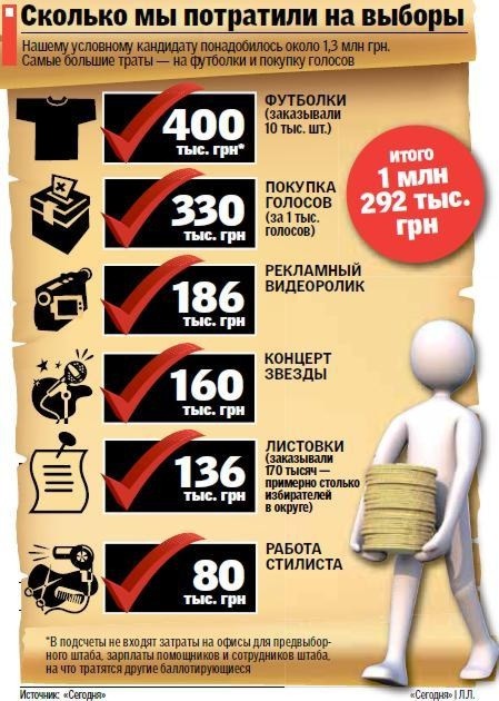 В течение двух месяцев наш корреспондент вел предвыборную кампанию. Мы попытались максимально вжиться в роль кандидата, чтобы выяснить, как делается черный пиар, за сколько готовы выступить во дворах звезды, можно ли подкупить жэк, директоров школ и других избирателей. Все это у нас получилось, и кампания примерно «обошлась» в чуть более миллиона гривен (см. ниже графику). Впрочем, политологи говорят, что мы отделались легким испугом, поскольку в среднем каждый кандидат-мажоритарщик выкладывает нынче $2—3 млн. Это примерно четыре-шесть новеньких «нафаршированных» «Феррари» стоимостью порядка $500 тысяч.