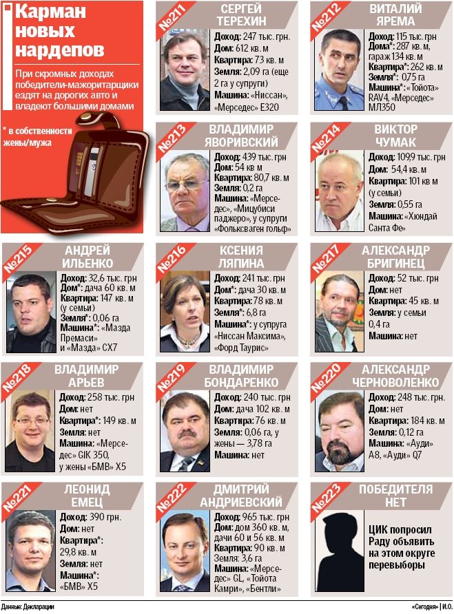 Со стажем. Оппозиционер Ксения Ляпина хоть и одержала победу в 216 округе, но ее конкурент - бывший родственник Черновецкого Александр Супруненко — завалил ее судебными исками. В активах у семьи Ляпиной — квартира, маленькая дача и 6,8 га земли. «Мы живем в квартире родителей в центре. А земля нам досталась очень давно, ее нам отдали за долги, когда муж занимался предпринимательством. Сейчас она бурьяном заросла», — говорит Ляпина. Сама депутат гордится своими изменениями к Налоговому кодексу, которые позволили вернуть упрощенную систему налогообложения предпринимателям. И собирается дальше тоже заниматься законами, которые помогут предпринимателям и потребителям.