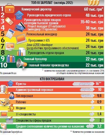 «Например, в среднем в октябре менеджерам по продажам предлагали 7000 грн в месяц — рост за полгода составил 10%», — говорит Герман Овчаренко, директор портала Superjob.ua. « Ключевой фактор для пересмотра зарплат сотрудникам сейчас — продуктивность их труда и эффективность бизнеса, но чаще всего жалованье повышают топ-менеджерам и уникальным специалистам, которых боятся потерять, — добавляет Татьяна Никитович. — Рядовым сотрудникам зарплаты если и увеличивают, то индивидуально. Компании, которые запланировали это сделать, определили повышение на уровне 10%, не больше». Совсем обидное положение у некогда престижных финансистов, аналитиков, трейдеров, юристов и инвестиционных банкиров. По словам Никитович, их доходы остались на уровне кризисного 2008 года, и за эти деньги теперь приходится работать больше, а в течение 10 месяцев этого года в ряде инвестиционных компаний были сокращения.