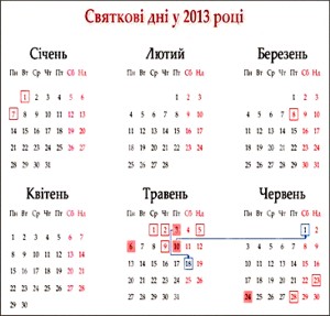 Всего же в 2013 году как нерабочие, поскольку на них приходятся государственные и религиозные праздники, определены: 1 и 7 января, 8 марта, 1, 2 и 9 мая, 28 июня и 24 августа. Пасха в 2013 году будет отмечаться 5 мая, а Троица - 23 июня. Кроме того, согласно статье 73 КЗоТ, выходные дни, на которые приходятся праздники, переносятся на последующие дни, а, следовательно, нерабочими будут 6 мая (следующий день после Пасхи), 24 июня (следующий день после Троицы) и 26 августа (поскольку День Независимости году будет отмечаться в субботу).