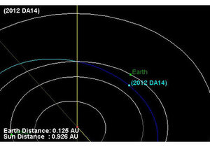 По словам сотрудника Лаборатории реактивного движения NASA Пола Чодаса, астероид 2012 DA14 пролетит на дистанции около 34,1 тысячи километров от центра Земли. Неопределенность этого значения составляет около 100 километров.