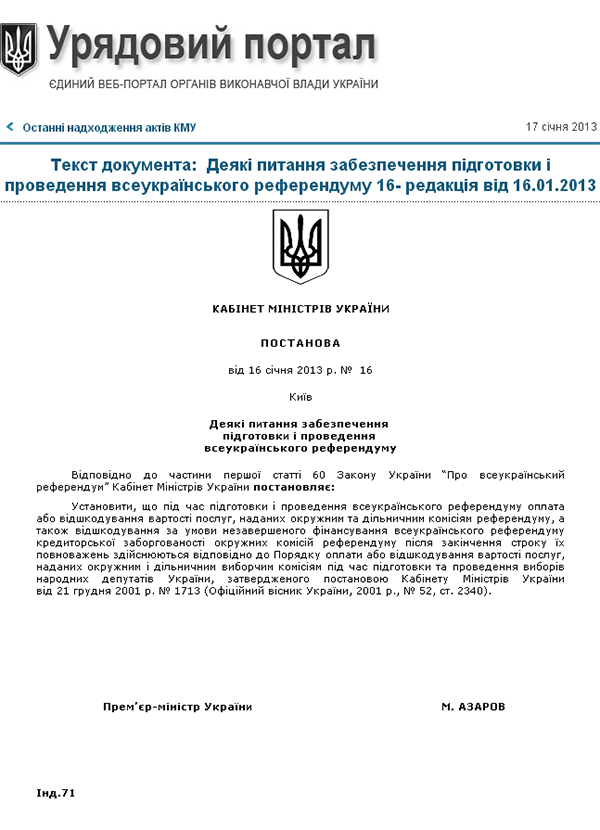 В среду, 16 января 2013 года, Кабинет Министров Украины принял постановление № 16 (индекс 71) "Некоторые вопросы обеспечения подготовки и проведения всеукраинского референдума".