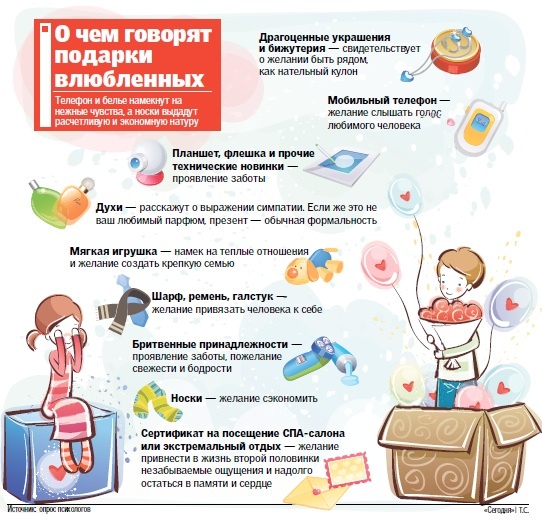 «Самый романтичный подарок на 14 февраля, как парню, так и девушке, — кольцо, символизирующее теплые чувства и намек на то, что в будущем вы хотите связать жизнь с этим человеком. Залогом того, что у вас большая симпатия к человеку, станут выбранные в подарок духи. Однако этот презент может сыграть злую шутку, если вы не знаете предпочтений человека», — объясняет профессор кафедры психологии ХНУ им. Каразина Евгений Заика. Беспроигрышный вариант — большая мягкая игрушка или подушка в форме сердца: они безмолвно рассказжут о симпатии ко второй половинке и даже поведают о тайном желании завести совместного ребенка.