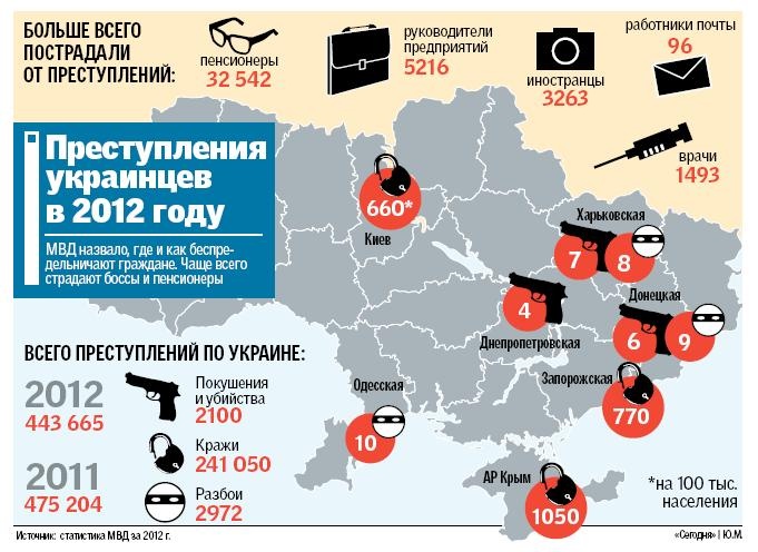Украинское МВД отрапортовало, сколько и какие преступления были совершены у нас в стране за прошлый год (до 20 ноября, когда вступил в силу новый УПК. — Авт.). Стражи порядка насчитали 443 665 уголовно наказуемых поступков (почти на 30 тысяч меньше, чем в 2011-м, подробнее — см. графику), а нарушителей закона — почти 195 тыс. человек (то есть каждый 235-й).