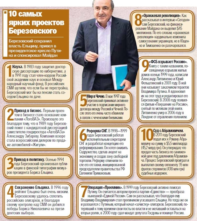 Московский адвокат Александр Добровинский считает, что Березовский покончил с собой. «Только что позвонили из Лондона. Борис Абрамович Березовский покончил с собой... Березовский не мог уйти из жизни 80-летним старичком гуляющим с палочкой по лондонскому парку. Он должен был сыграть еще одну роль в своей жизни. Последнюю», — написал он на своей страничке в Facebook. Версию о суициде он поясняет тем, что в последнее время БАБ находился «в ужасающем, жутком состоянии: одни долги, он был практически разорен, продавал картины (недавно он продал картину Уорхола «Красный Ленин» за $202 тысячи. — Авт.)». СМИ напоминают, что, проиграв иск Абрамовичу, Березовский впал в депрессию и даже прошел курс лечения. А в январе он еще и расстался со своей гражданской супругой Еленой Горбуновой. Она подала иск против Березовского на несколько миллионов фунтов стерлингов, из-за чего заморозили его активы. Она требовала от бывшего супруга 5 млн фунтов ($7,5 млн)