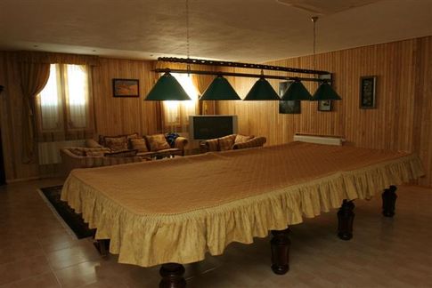 Нижний уровень — зона отдыха: небольшой бассейн, выложенный мелкой синей плиткой, парная, бильярдная и что-то вроде обеденной комнаты. Что бросается еще в глаза, так это то, что практически в каждой комнате стоит плоский телевизор с большим экраном, а по стенам висят картины, которых во множестве надарили Леониду Даниловичу, и иконы.