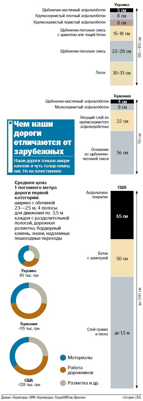 30 лет без ремонтов. Не новость, что на многих дорогах, особенно пролегающих между селами в глубинке, на квадратный метр порой приходится по 3—4 ямы. По мнению председателя «Укравтодора» Евгения Прусенко, главная причина в том, что эти дороги не ремонтируются по 30—40 лет, хотя по нормам положено раз в 5 лет проводить текущий, так называемый «средний», ремонт, а раз в 10—12 лет — капитальный (в чем их суть — см. инфографику). Тогда и ям не будет, и расходы на ремонт станут намного меньше. «Некоторые говорят, что наши стандарты строительства автодорог устарели по сравнению с западными, что мы используем отсталые советские технологии и материалы, — говорит Прусенко. — Ничего подобного. Мы перешли на европейские стандарты еще в 1986 году, начав применять щебеночно-мастичный асфальтобетон — это смешанный каменный материал, битум, минеральный порошок. Параметры по ширине проезжей части у нас такие же, как в Германии. Другое дело, что у них, исходя из интенсивности движения, давно строят шестиполосные дороги, у нас же большинство трасс можно было и четырехполосными не делать. Что касается прочности дорожной одежды — основания и покрытия, — то до 1972 г. мы считали нагрузку по 6 т на ось (груженый ЗиЛ-самосвал), с 1972-го перешли на 10 т на ось (КамАЗ, МАЗ), с 2000 г. — на 11,5 т (фура МАН, «Вольво»). В Германии — 11,5 т на ось, во Франции — 13, во многих других — 10,5. Но у них с тяжелых грузовиков за проезд берут немалую плату — 16—28 евроцентов за километр. И на эти деньги содержат дороги (похожий законопроект не так давно был подан в Раду. — Авт.)». В «Укравтодоре» говорят, что современную технологию отработали во время строительства трассы Киев—Одесса, там в 2004—2005 гг. обновлено около 40% дороги, или 212 км между Жашковом и Краснознаменкой. Прошло 8 лет — и участок ровный, несмотря на интенсивность движения. С 2004 года все конструкции близки к немецким: накладываются три слоя асфальтобетона — крупнозернистый пористый, крупнозернистый плотный и сверху щебеночно-мастичный (как выглядит современная дорога — см. инфографику). Увы, таких дорог — раз-два и обчелся: автострады Киев—Борисполь, из Киева на Вышгород, на Конча-Заспу. Еще можно вспомнить реконструированные к Евро-2012 участки дорог на западе и северо-западе. Это Киев—Чоп (одну из развязок см. на фото), Киев—Львов, Львов—Берковец, Львов—Рава-Русская, отдельные участки на трассах Киев—Житомир, Киев—Ковель. Всего за 2012 год обновлен 1061 км дорог, за 2011-й — 2007 км, за 2010-й — 973. Ранее было сделано 321 км (2008 г.) и 92 км (2009 г.).